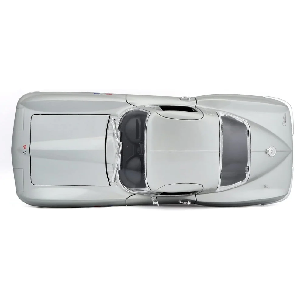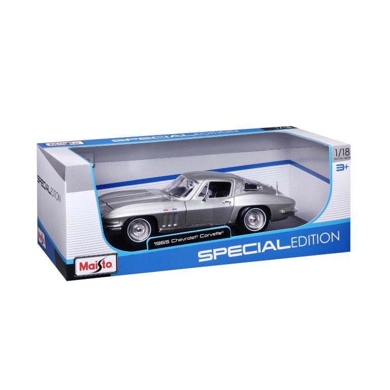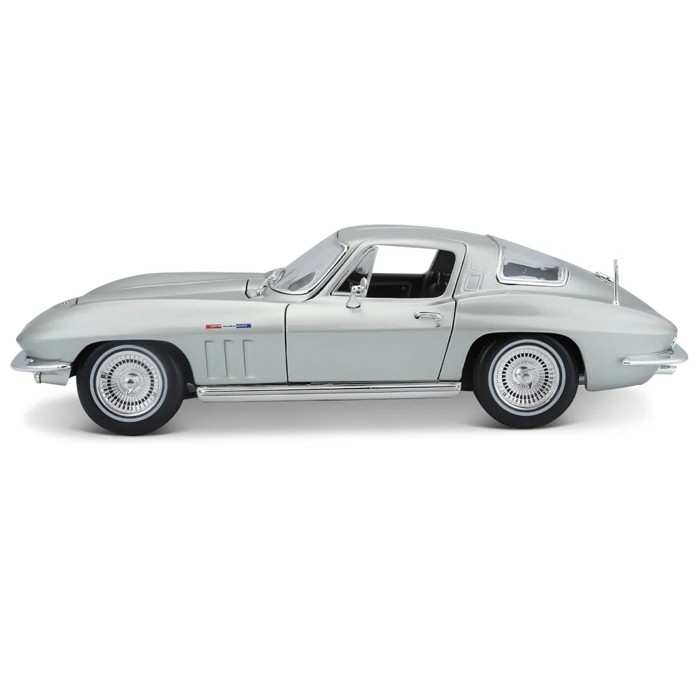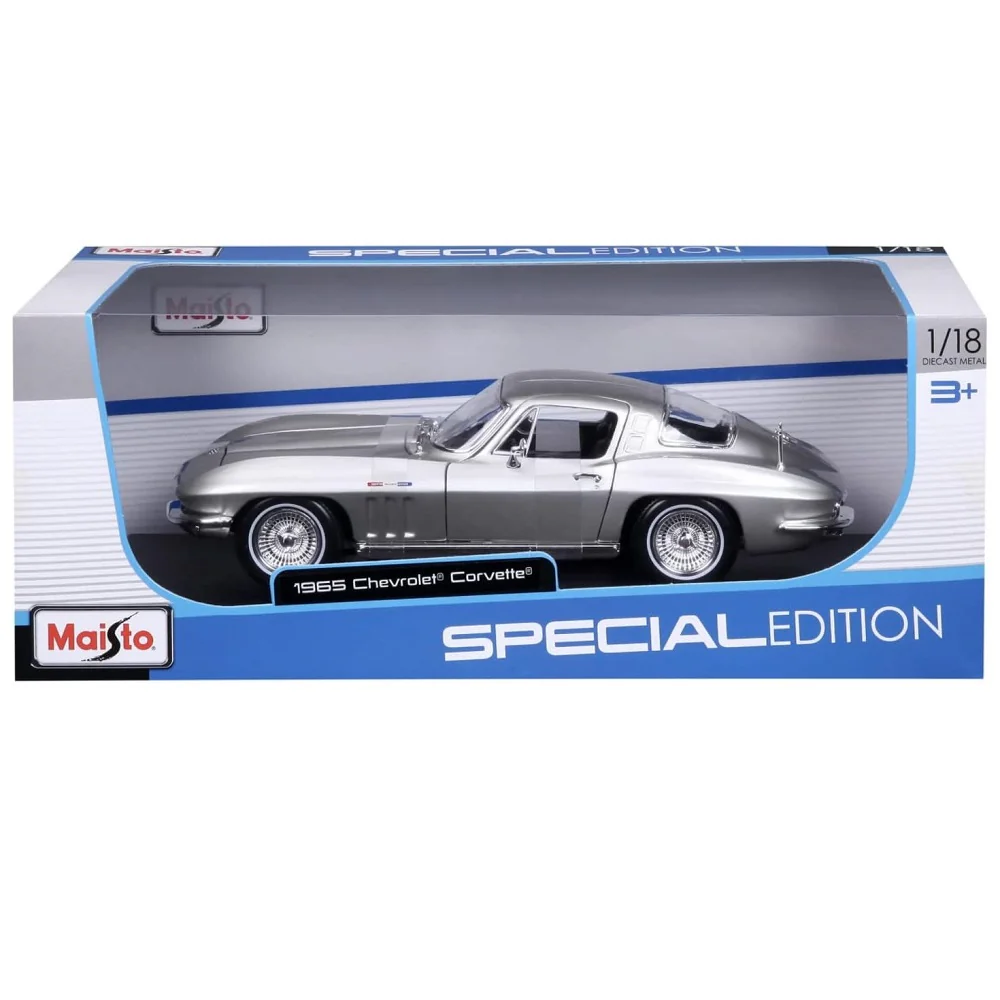 דגם מרהיב של שברולט קורבט 1965 בצבע כסוף, מבית Maisto, במהדורה מיוחדת. עשוי מברזל משולב באביזרי פלסטיק ומעוצב בקפידה לשחזור אותנטי של הרכב הקלאסי.